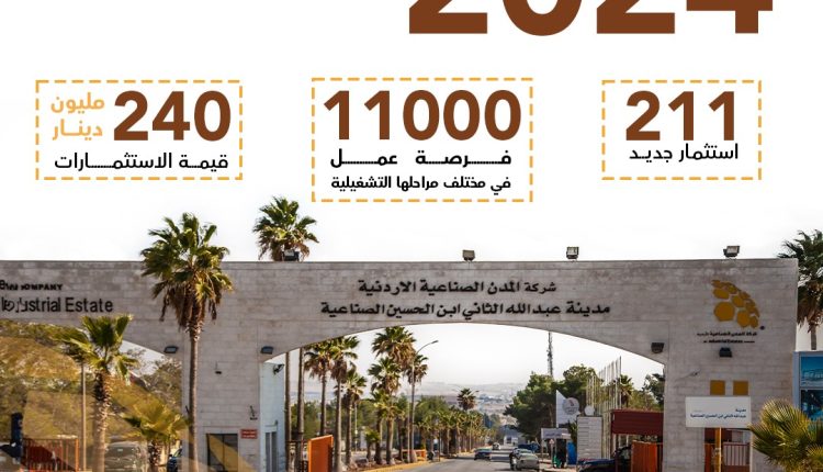 فقد أعلن مدير عام شركة المدن الصناعية الاردنية السيد عمر جويعد عن استقطاب 211 استثمار جديد خلال العام 2024 للمدن الصناعية العاملة في مختلف محافظات المملكة بحجم استثمار يقارب (240) مليون دينار اردني يتوقع أن توفر قرابة (11) الف فرصة عمل في مختلف مراحلها التشغيلية.