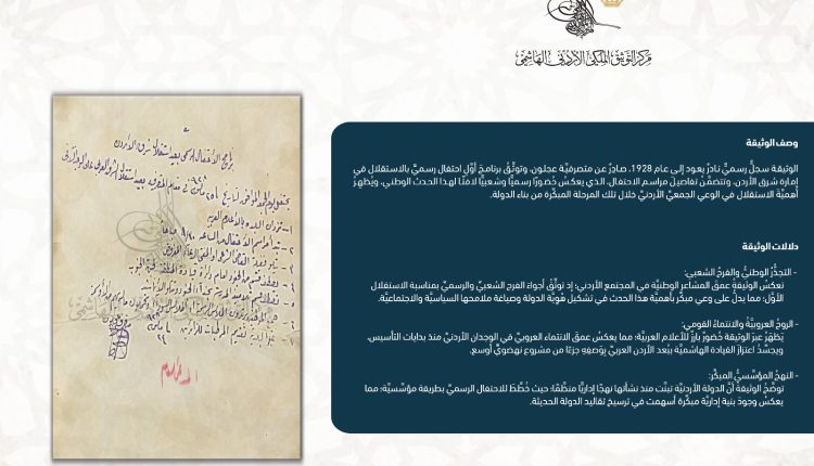 حصادنيوز – في مناسبة الذكرى 79 لاستقلال المملكة الأردنية الهاشمية، عرض مركز التوثيق الملكي الأردني الهاشمي وثيقة تاريخية نادرة تعود إلى عام 1928، تكشف لأول مرة عن تفاصيل أول احتفال رسمي بالاستقلال في إمارة شرق الأردن، الذي نظمته متصرفية عجلون آنذاك.