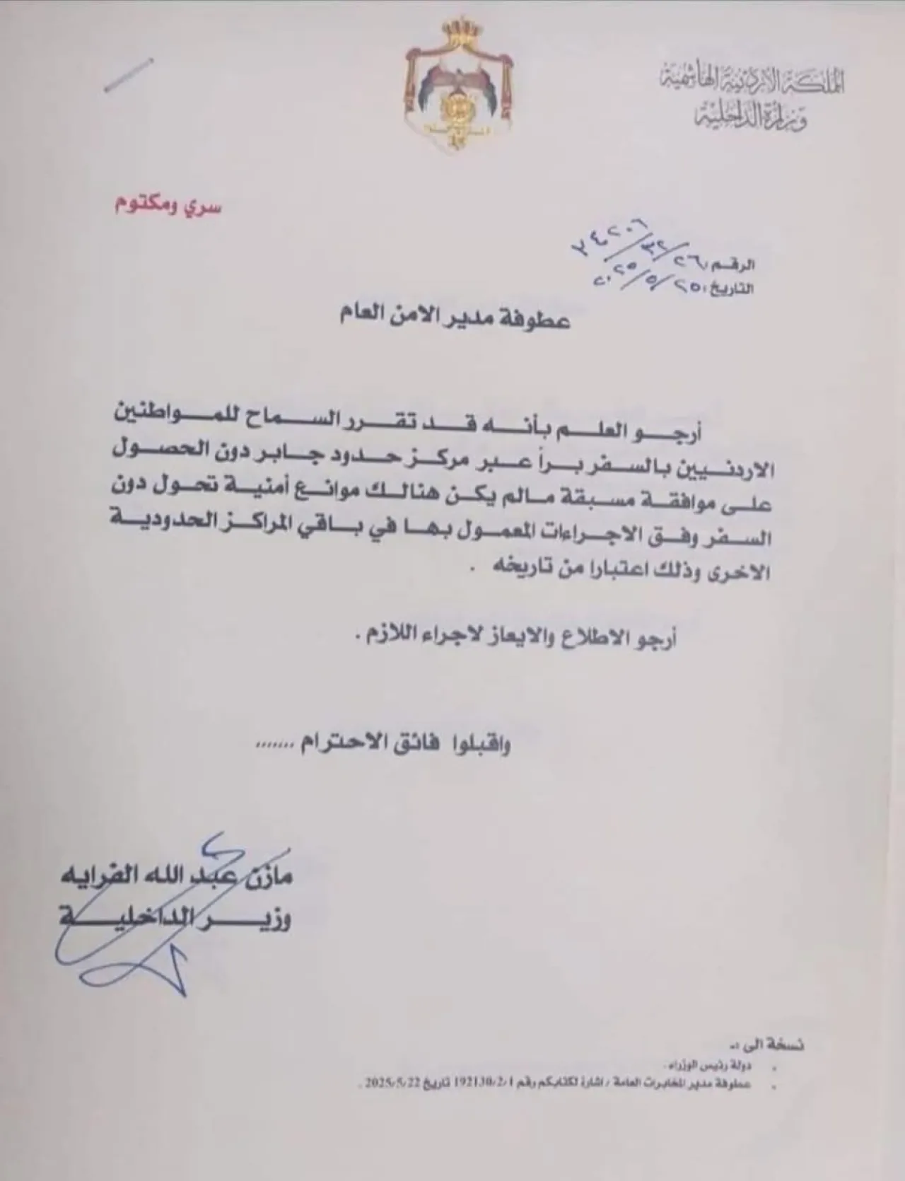 حصادنيوز – قرر وزير الداخلية مازن الفراية السماح للمواطنين الأردنيين بالسفر برا عبر مركز حدود جابر دون الحصول على موافقة مسبقة وفقا لكتاب متداول عن وزارة الداخلية .
