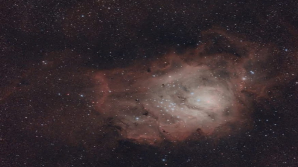 حصادنيوز – تمكن فريق من المصورين الفلكيين من الجمعية الفلكية الأردنية ومركز الفلك الدولي، فجر الثلاثاء، من رصد وتصوير سديم البحيرة (Lagoon Nebula) من موقع قصر الخرانة التاريخي، الذي يبعد قرابة 60 كيلومترًا شرق العاصمة عمّان، والذي رصد في ليلة صافية تزينت فيها سماء الصحراء الأردنية بنجومها المتلألئة.