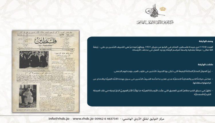حصادنيوز – عرض مركز التوثيق الملكي الأردني الهاشمي، في الذكرى الـ94 لوفاة الشريف الحسين بن علي، لوثيقة نادرة تظهر الصفحة الأولى من جريدة “فلسطين”، في عددها الصادر بتاريخ الرابع من حزيران عام 1931، والذي تزامن مع يوم إعلان الوفاة.