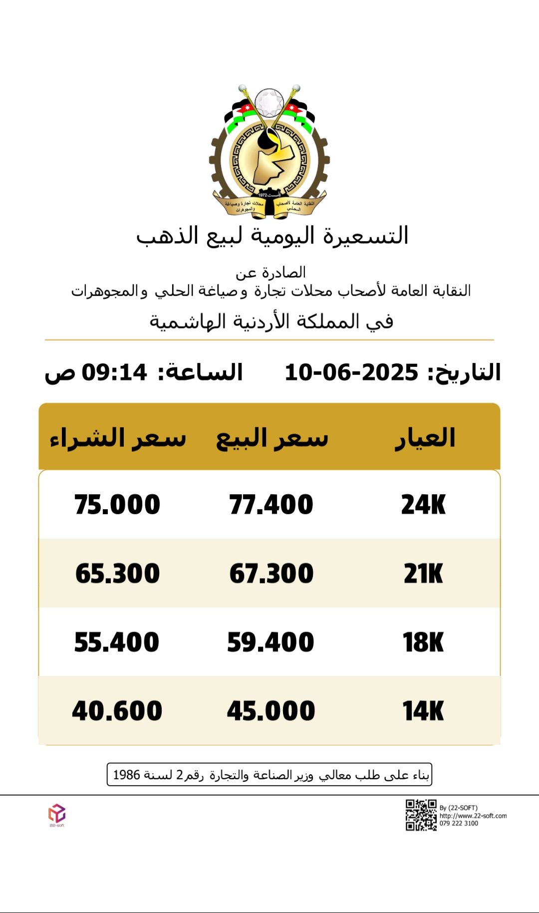 كما بلغ سعر بيع الغرام الواحد من الذهب عيارات 24 و18 و14 لغايات البيع من محالّ الصاغة، 77.40 و59.40 و45.00 دينارا، على التوالي.
