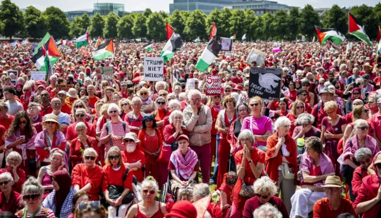 وفي ميدان ماليفيلد بمدينة لاهاي، تجمع آلاف الأشخاص للاحتجاج على دعم بلادهم لإسرائيل.