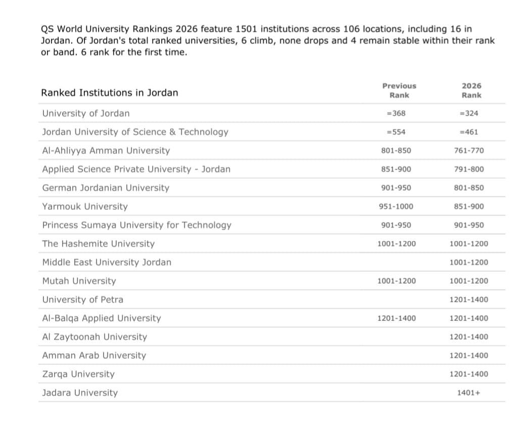 عمان الأهلية بالمرتبة 761عالمياً والأولى محلياً على الجامعات الخاصة والثالثة بعد الأردنية والتكنولوجيا بتصنيف كيوأس 2026