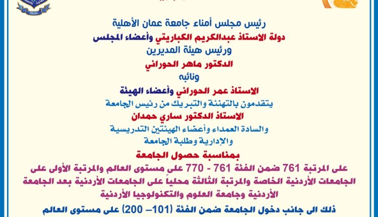 بمناسبة حصول الجامعة على المرتبة 761 ضمن الفئة 761 – 770 على مستوى العالم والمرتبة الأولى على الجامعات الأردنية الخاصة والمرتبة الثالثة محلياً على الجامعات الأردنية بعد الجامعة الأردنية وجامعة العلوم والتكنولوجيا الأردنية.