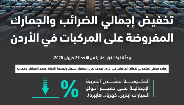 الحكومة تخفّض الضريبة الإجمالية (العامّة والخاصة) على المركبات ضمن حزمة إصلاح هيكلي وشمولي تسهم بشكلٍ كبير في تخفيف الكلف على المواطنين