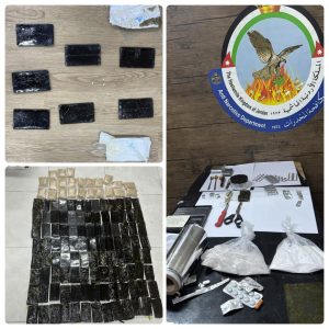 وفي لواء عين الباشا تمت مداهمة تاجر للمخدرات وأُلقي القبض عليه وضبط بحوزته 76 كف حشيش ، فيما وضُبط سبع كفوف حشيش بحوزة مروج للمخدرات في محافظة الزرقاء.