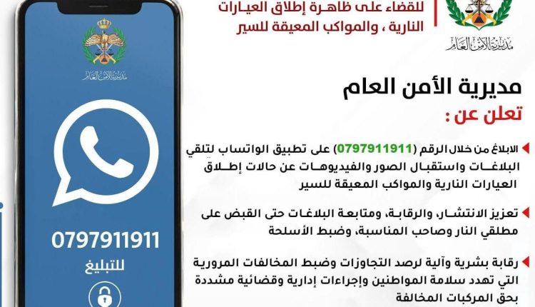وأعلنت المديرية عن الرقم (0797911911) عبر تطبيق الواتساب لتلقّي البلاغات واستقبال الصور والفيديوهات التي توثّق حالات إطلاق العيارات النارية والمواكب المخالفة والمعيقة، بهدف تسريع الاستجابة وضبط المتورطين.