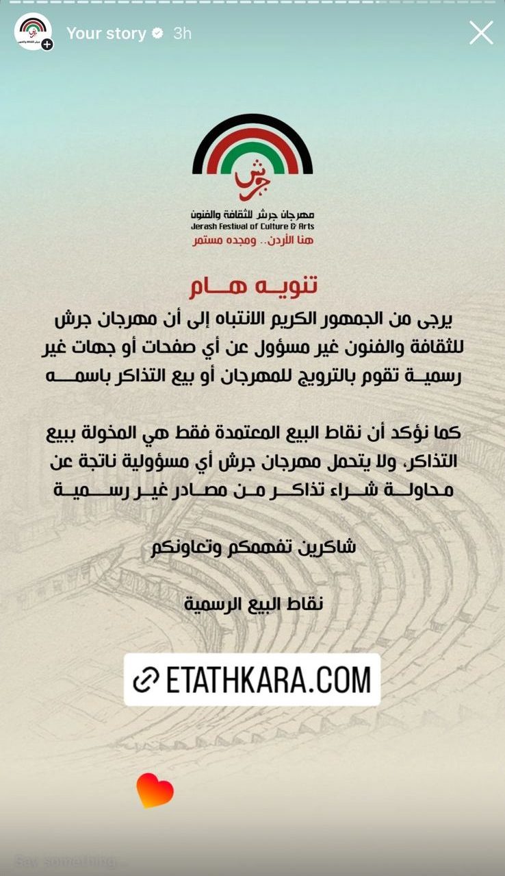 ودعت الادارة في بيان صحفي إلى أخذ الحيطة والحذر من هذه الصفحات او الجهات غير الرسمية، مؤكدة أن التذاكر الرسمية لكافة فعاليات مهرجان جرش للثقافة والفنون متوفرة من خلال الموقع الإلكتروني ETATHKARA.COM.