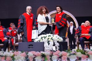 وقامت راعية الحفل سمو الاميرة آية بنت فيصل والى جانبها رئيس الجامعة بتكريم خريجة الجامعة المخرجة المبدعة، مادونا حنا، من قسم التصميم السينمائي في كلية العمارة والتصميم ، التي واصلت مسيرتها الأكاديمية بالتحاقها بالمعهد العالي لفنون الطفل، وقُبلت ضمن أوائل الطلبة في برنامج ماجستير إخراج المسرح والسينما ، وتألقت بإخراج مسرحية “يافا والباب الأزرق”، التي فازت مع فرقتها بثلاث جوائز في مهرجان المسرح الدولي بالإسكندرية.