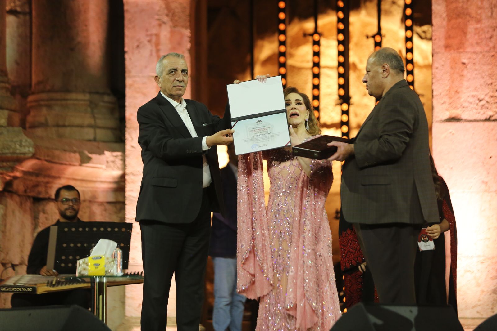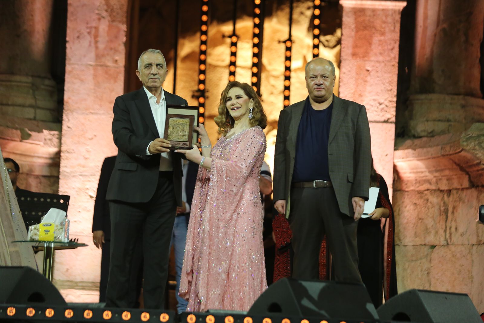 وفي ختام الأمسية، كرّمت إدارة مهرجان جرش الفنانة ميادة الحناوي، حيث قدّم لها وزير الثقافة والمدير التنفيذي للمهرجان أيمن سماوي درع المهرجان تكريمًا لعطائها الفني المميز.