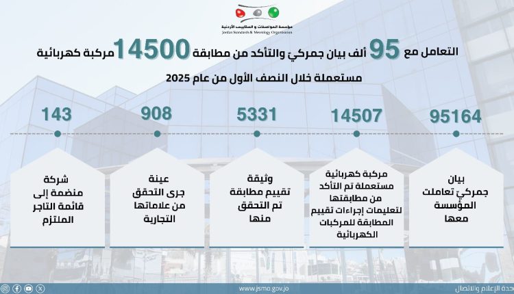 حصادنيوز – تعاملت مؤسسة المواصفات والمقاييس، خلال النصف الأول من العام الحالي، مع 95164 بيانا جمركيا.