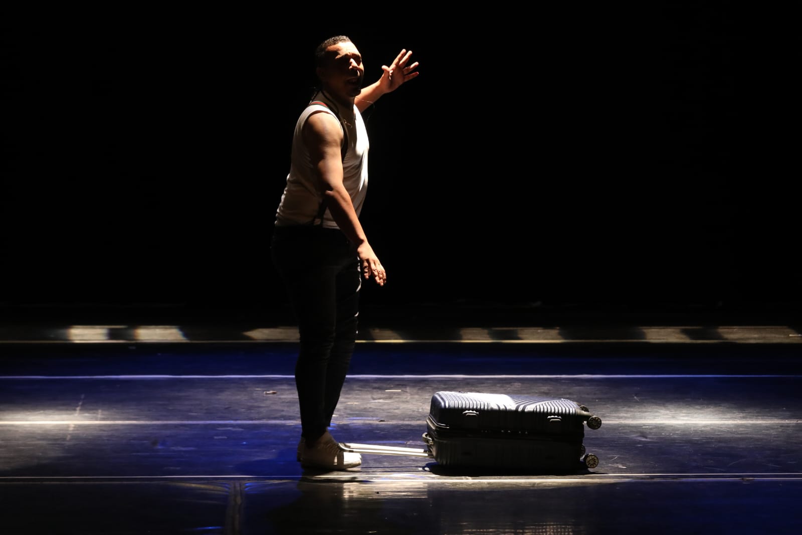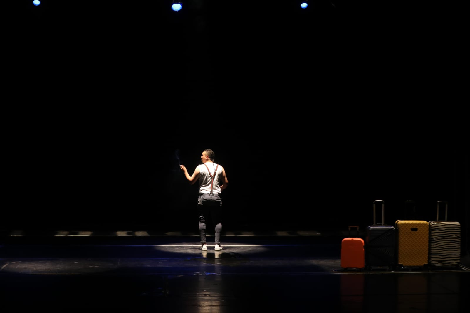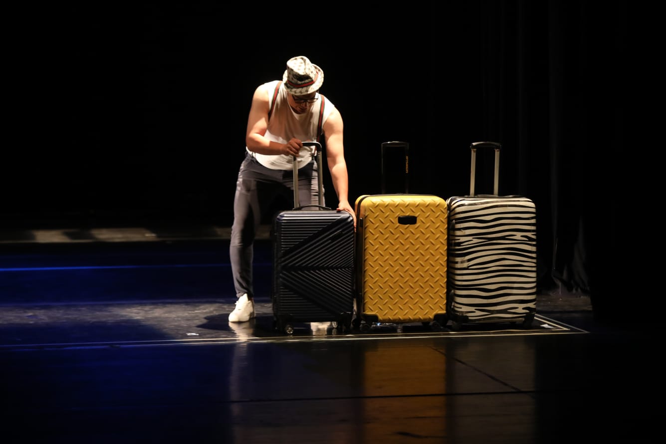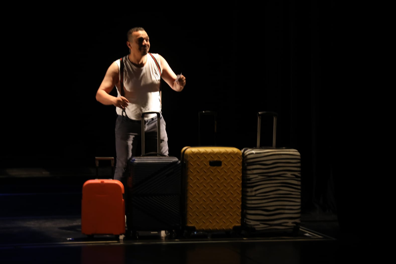 وتقمّص الفنان الليبي حسين العبيدي شخصية “المسافر” الذي وقف وحيدًا على الخشبة، محاطًا بحقائب لا تقتصر رمزيتها على الوزن المادي، بل تنوء بحمولة روحية ووجدانية من الذكريات والأحلام والخذلان والحنين. ورافقه موسيقيًا الفنان أنس العريبي، الذي عزّز بالألحان الحيّة توتر العرض وإيقاعه الشعوري، مضفيًا عليه بعدًا دراميًا محكمًا.