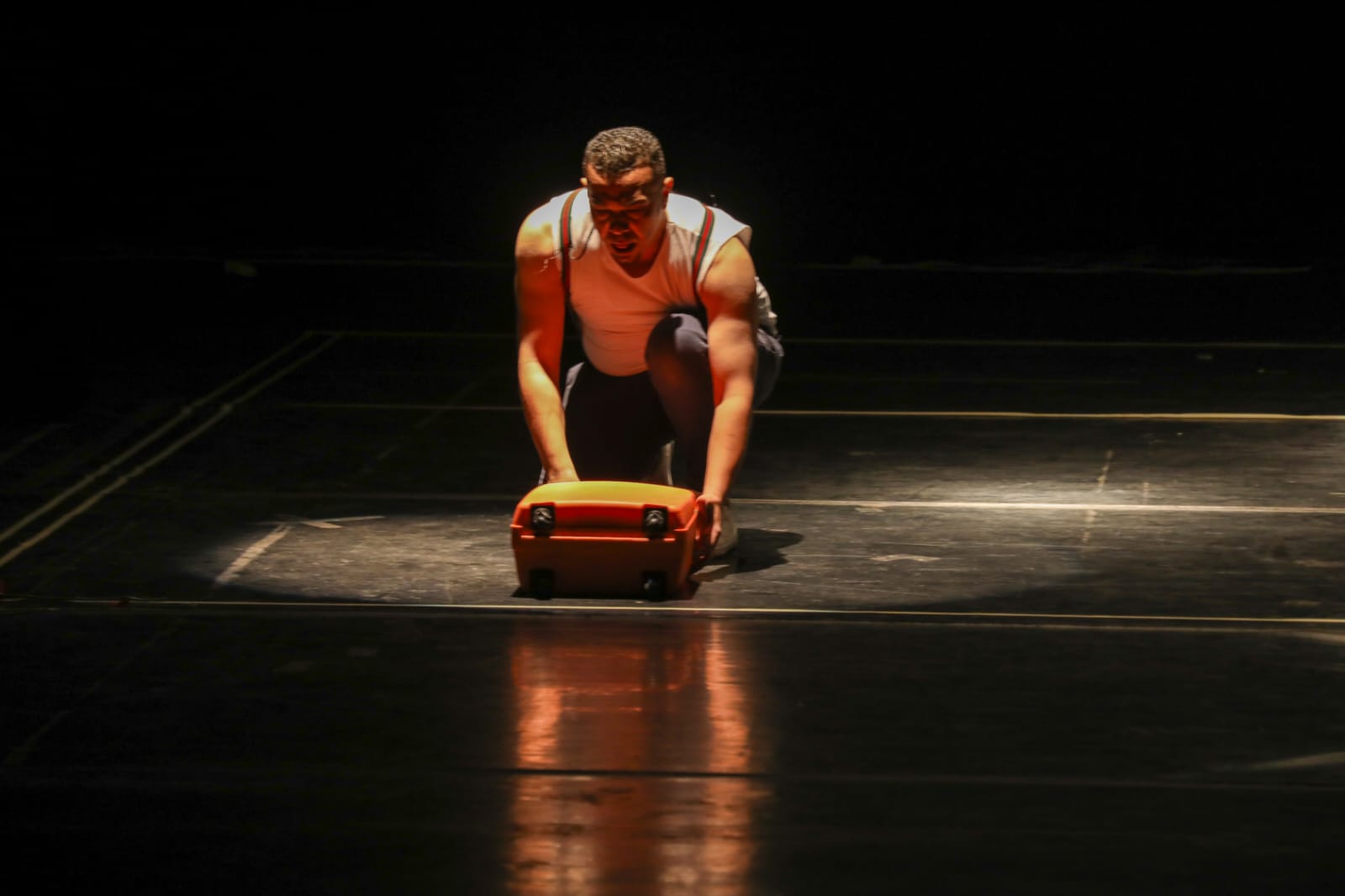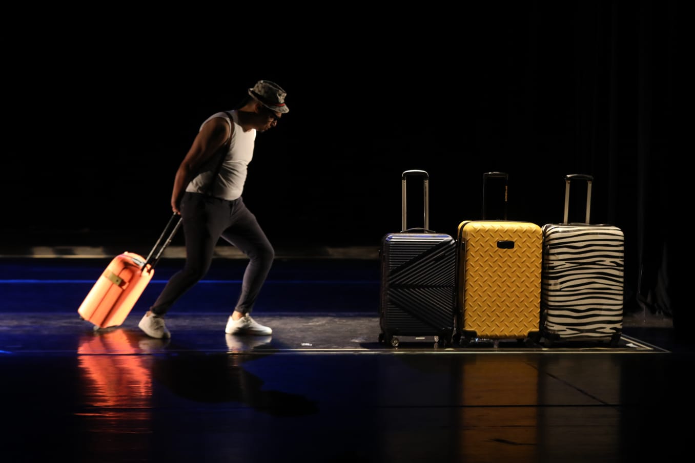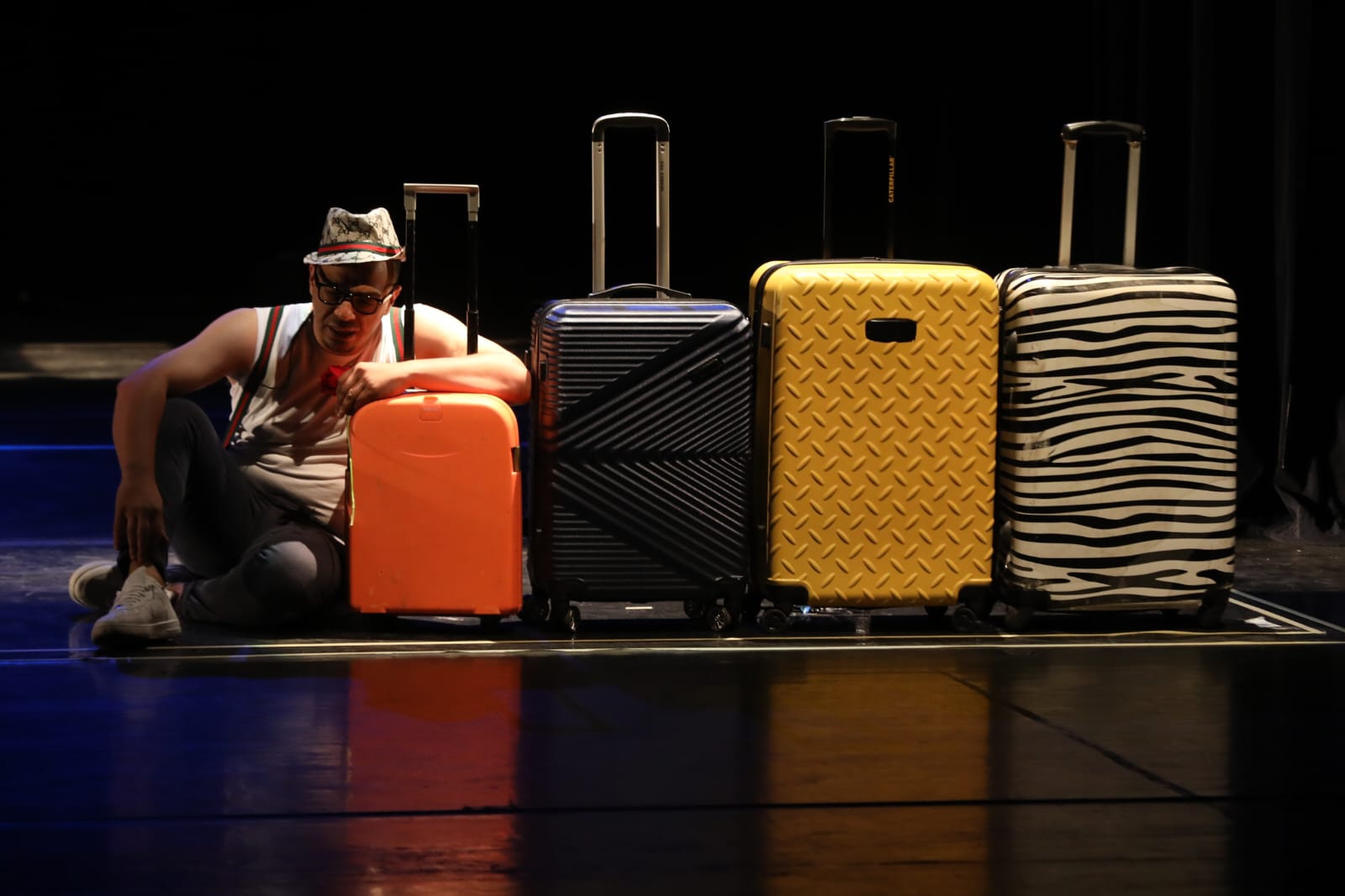 وتقمّص الفنان الليبي حسين العبيدي شخصية “المسافر” الذي وقف وحيدًا على الخشبة، محاطًا بحقائب لا تقتصر رمزيتها على الوزن المادي، بل تنوء بحمولة روحية ووجدانية من الذكريات والأحلام والخذلان والحنين. ورافقه موسيقيًا الفنان أنس العريبي، الذي عزّز بالألحان الحيّة توتر العرض وإيقاعه الشعوري، مضفيًا عليه بعدًا دراميًا محكمًا.