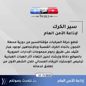 حصادنيوز – الكرك – أعلنت الجهات الأمنية، اليوم الخميس، عن إغلاق مؤقت لحركة السير على الطريق الواصل من دورية محطة اللجون باتجاه مدينة الكرك (القصبة)، وذلك في كلا الاتجاهين، نتيجة تعرض المنطقة لموجة غبار كثيف أدّت إلى تدنٍ كبير في مدى الرؤية الأفقية، خاصة على طريق زحوم.