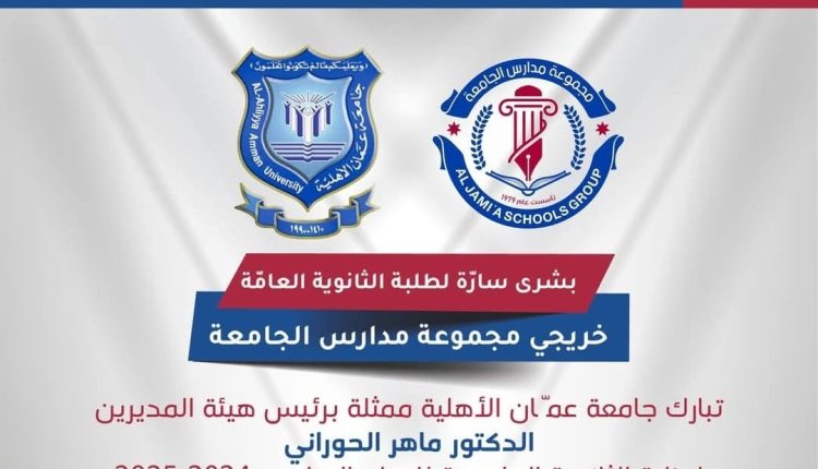 عمان الاهلية تبارك لطلبة مدارس الجامعة الناجحين في الثانوية وتعلن عن منحهم خصومات مجزية