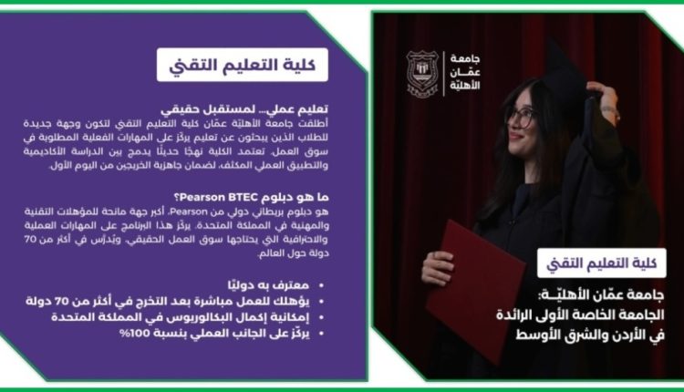 حصادنيوز – تُقدّم كلية التعليم التقني في جامعة عمّان الأهليّة للطلبة الناجحين في الثانوية العامة برامج دبلوم دولية ووطنية متخصصة، معتمدة من مؤسسة Pearson BTEC البريطانية، والتي تُعد من أبرز الجهات العالمية في التعليم المهني والتقني.