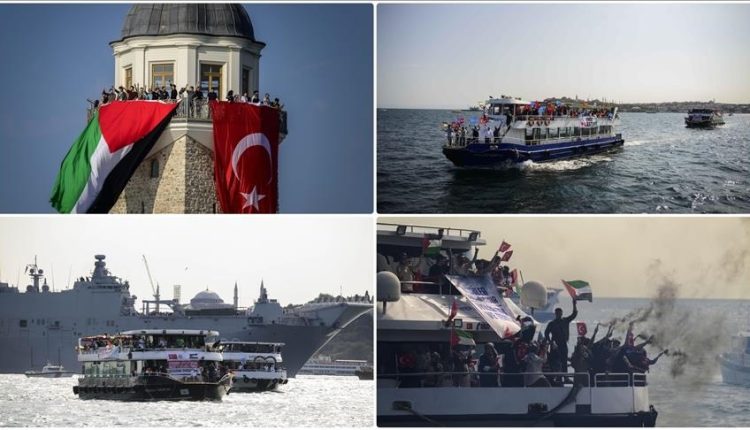 ورفعت السفن لافتات حملت شعارات من قبيل: “من قلب البوسفور.. لم نترك غزة وحدها” و”الحرية لفلسطين”.