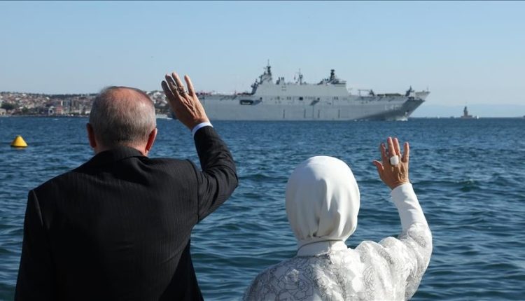 حصادنيوز – حيّا الرئيس التركي رجب طيب أردوغان من قصر دولمة باهتشة بإسطنبول، الأحد، 9 سفن بينها حاملة المسيّرات “تي جي غي أناضولو” أثناء مرورها من مضيق البوسفور ضمن استعراض “تكنوفيست الوطن الأزرق”.