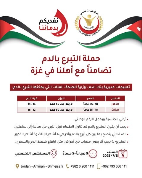 وتأتي هذه المبادرة الإنسانية والوطنية امتدادًا لمواقف الأردن الثابتة، بقيادة جلالة الملك عبدالله الثاني ابن الحسين المعظم، في نصرة الشعب الفلسطيني وقضيته العادلة، وتخفيفاً لمعاناة أهل غزة وتضامناً معهم في ظل الحصار الخانق والنقص الحاد في وحدات الدم، ما يجعل التبرع اليوم أكثر من مجرد واجب، بل رسالة حياة.