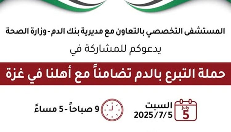 حصادنيوز –أعلن الدكتور فوزي الحموري، رئيس جمعية المستشفيات الخاصة ومدير عام المستشفى التخصصي، اليوم الأربعاء عن إطلاق حملة تبرع بالدم تحت شعار “نفديكم بدمائنا” ، دعمًا لأهلنا في قطاع غزة، وذلك يوم السبت 5 تموز 2025، في مقر المستشفى التخصصي.
