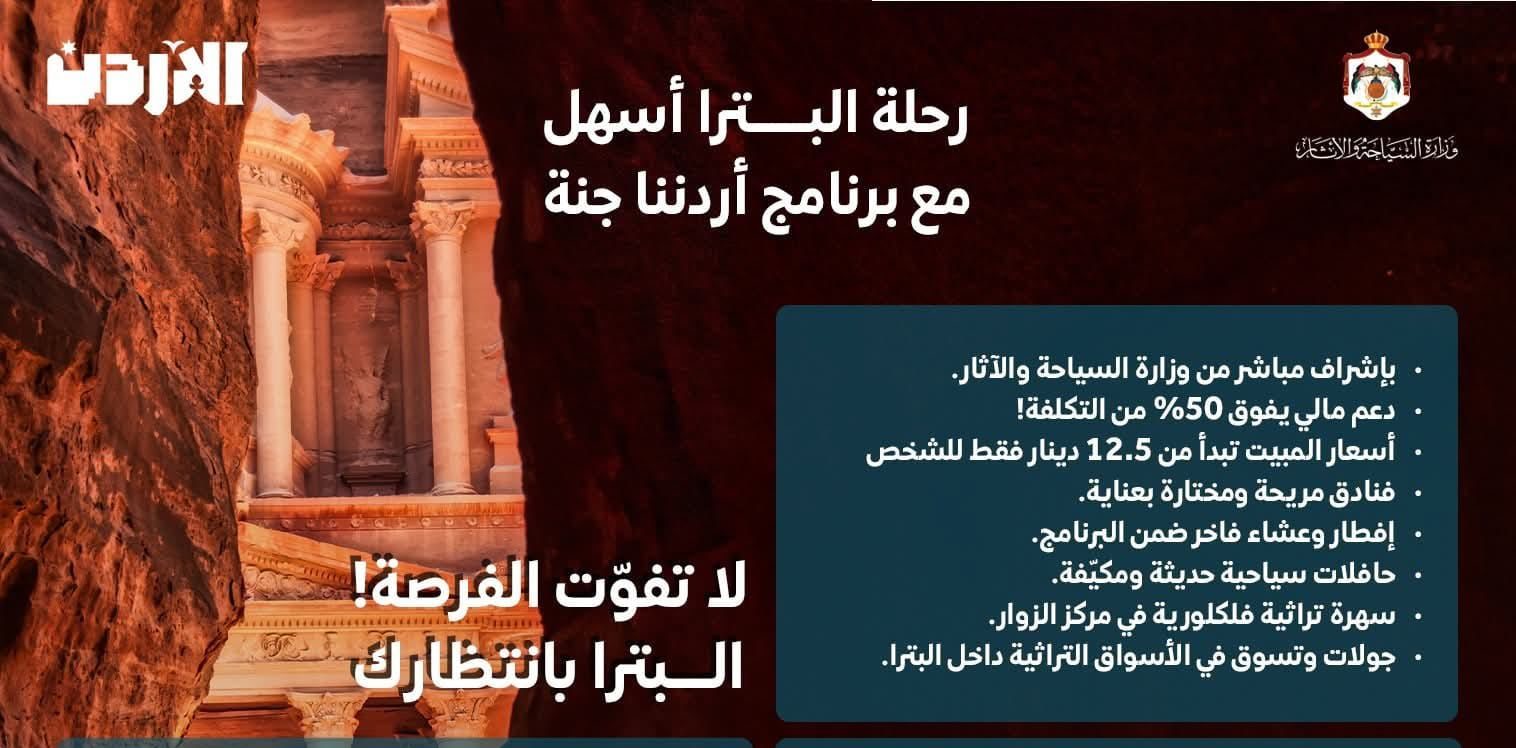 ويشمل البرنامج الجديد فئات شابة، ويؤمن إقامة مريحة في فنادق مختارة، وحافلات سياحية مجهزة، ووجبات فاخرة، إضافة إلى سهرة تراثية فلكلورية وفرصة للتجول والتسوق في الأسواق التراثية بالمدينة، ضمن جهود الوزارة لدعم القطاع السياحي وتعزيز الحركة الاقتصادية في البترا.