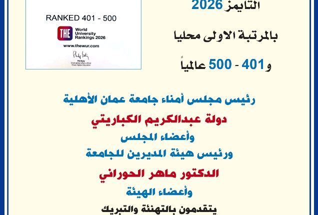 عمان الاهلية تهنىء أسرتها بمناسبة فوزها بتصنيف التايمز 2026 بالمرتبة الاولى محليا و401 – 500 عالميا