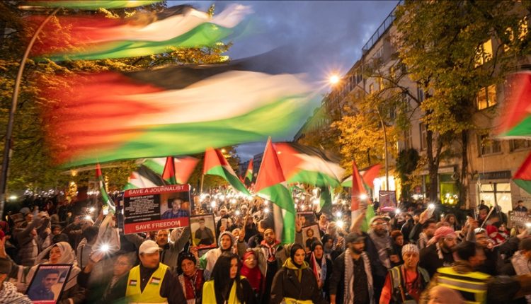 وردّد المشاركون هتافات من قبيل “إسرائيل إرهابية”، و”لا سلام على أرض مغتصبة”، و”الحرية لفلسطين”، ورفعوا لافتات تنتقد دعم برلين العسكري لإسرائيل.