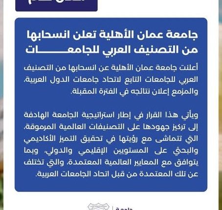 حصادنيوز – أعلنت جامعة عمان الأهلية عن انسحابها من التصنيف العربي للجامعات التابع لاتحاد جامعات الدول العربية، والمزمع إعلان نتائجه في الفترة المقبلة.