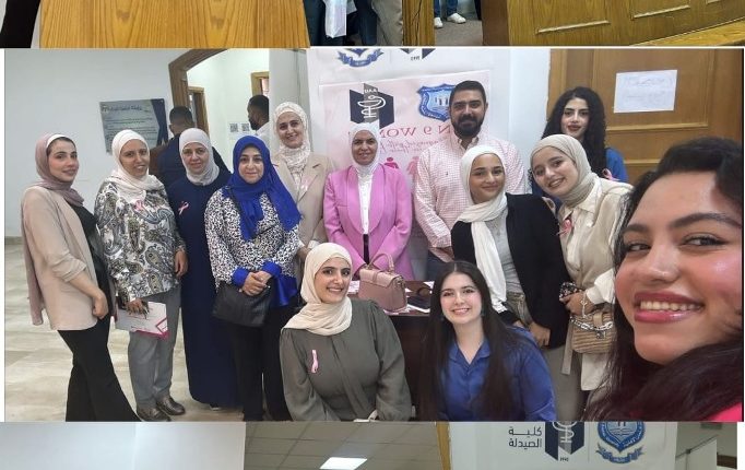 وهدفت الفعالية إلى نشر الوعي بين النساء بأهمية الفحص المبكر والكشف الدوري، وتشجيعهن على تبني أنماط حياة صحية للوقاية من سرطان الثدي. وقد مثّل الكلية في هذه الفعالية عدد من أعضاء الهيئة التدريسية، إلى جانب مشاركة متميزة من نادي طلاب الصيدلة، حيث قاموا بتوزيع بروشورات توعوية وتقديم شروحات مبسطة ومباشرة للنساء حول أهمية الفحص المبكر والعوامل الوقائية، بالإضافة إلى تقديم نصائح دوائية.