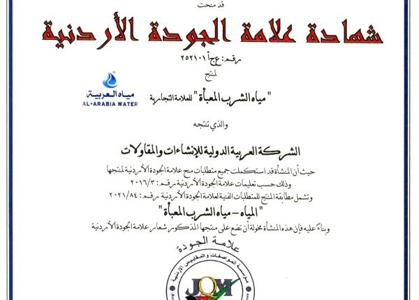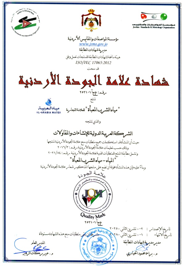 حصل مصنع مياه العربية التابع للشركة العربية الدولية للإنشاءات والمقاولات، المملوكة للقوات المسلحة الأردنية، على شهادة علامة ضبط الجودة الأردنية الصادرة عن مؤسسة المواصفات والمقاييس الأردنية، بعد استيفاء المصنع لكافة المعايير والمتطلبات الفنية المتعلقة بجودة المياه المعبأة وسلامتها بحضور مدير عام الشركة العربية الدولية للإنشاءات والمقاولات .