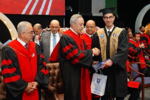 حيث قام قام راعي الحفل والى جانبه رئيس الجامعة بتسليم الشهادات للخريجين والخريجات والجوائز التقديرية للمتفوقين .
