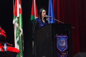 وألقت كلمة الخريجين الطالبة الخريجة دانا عدنان المغربي/ ماجستير العلوم الصيدلانية ، حيث رحبت براعي الحفل ورئيس الجامعة وزملائها الخريجين والخريجات والحضور ثم قالت :