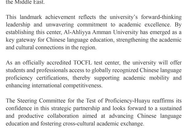 وأضافت أن اعتماد مركز اللغات في الجامعة كمركز رسمي للاختبار سيوفر للطلبة والمهنيين في الأردن والمنطقة فرصة الحصول على شهادة دولية معترف بها في إتقان اللغة الصينية دون الحاجة إلى السفر خارج المنطقة، الأمر الذي يسهم في تعزيز الحراك الأكاديمي ويفتح آفاقًا أوسع للدراسة والعمل في البيئات الأكاديمية والاقتصادية المرتبطة باللغة الصينية.