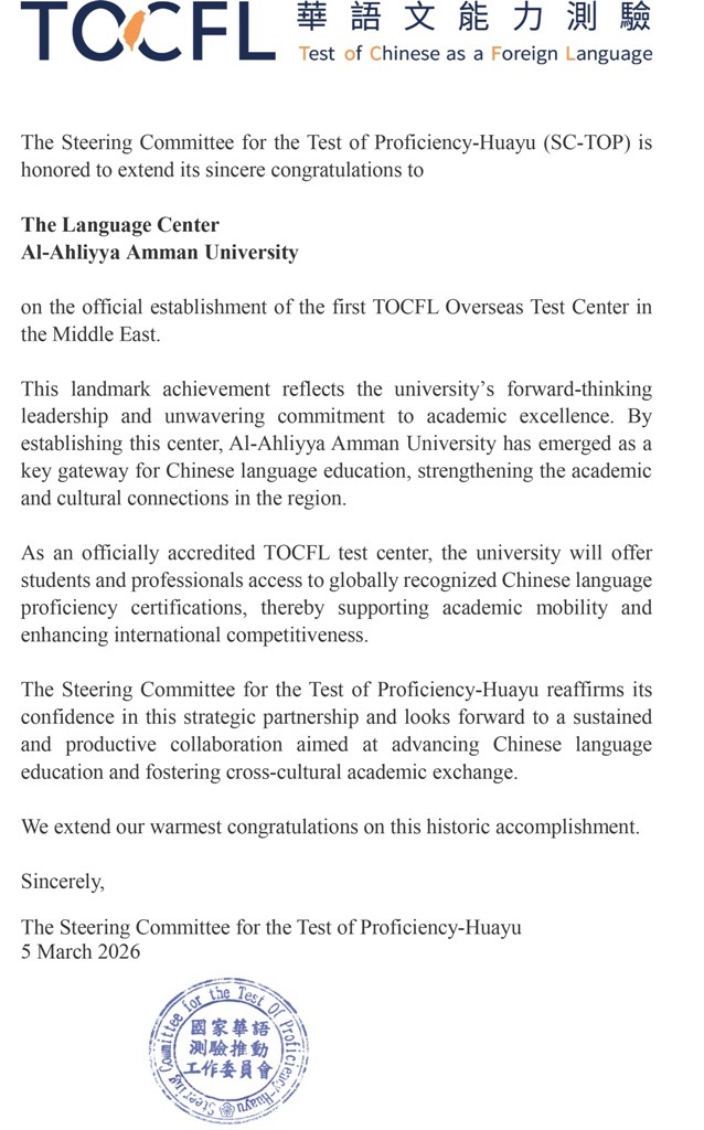 عمّان الأهلية تُعتمد كأول مركز دولي لاختبار TOCFL للغة الصينية في الشرق الأوسط