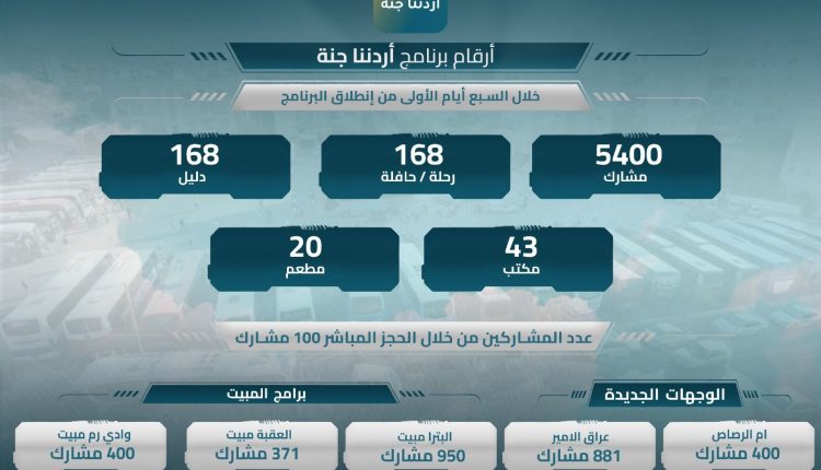 حصادنيوز – حقق برنامج أردننا جنة خلال الأسبوع الأول من انطلاقه مؤشرات إيجابية تعكس حيوية القطاع وشموليته لمكونات القطاع السياحي، حيث بلغ عدد المشاركين 5400، توزعوا على 168 رحلة وحافلة بمشاركة 168 دليلا سياحيا و43 مكتب سياحة وسفر و20 مطعما و30 فندقا ومخيما سياحيا.