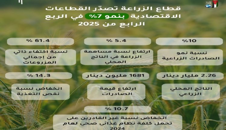ولفت الى أن قطاع الزراعة حقق أعلى نسبة نمو خلال الربع الرابع من عام 2025، متصدرا القطاعات الاقتصادية بنسبة بلغت 7 بالمئة، كما بلغت قيمة الناتج المحلي الزراعي بالأسعار الثابتة نحو 2.26 مليار دينار في عام 2025، وارتفعت مساهمة القطاع الزراعي في الناتج المحلي الإجمالي من 5.1 بالمئة عام 2024 إلى 5.4 بالمئة العام الماضي.