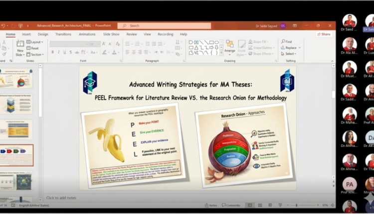 حصاد نيوز – في إطار السعي المستمر لتطوير المهارات البحثية لدى طلبة الدراسات العليا، وبهدف تعزيز الممارسات الإشرافية في توعية الطلبة وتوجيههم نحو إتقان مهارات الكتابة الأكاديمية الرصينة وإعداد أطروحات علمية تتسم بالعمق المنهجي، نظمت كليتا الدراسات العليا والأعمال ورشة عمل علمية متخصصة بعنوان “استراتيجيات الكتابة المتقدمة في كتابة الرسائل الجامعية: إطار PEEL للأدبيات السابقة وبصلة البحث لمنهجية البحث العلمي”.