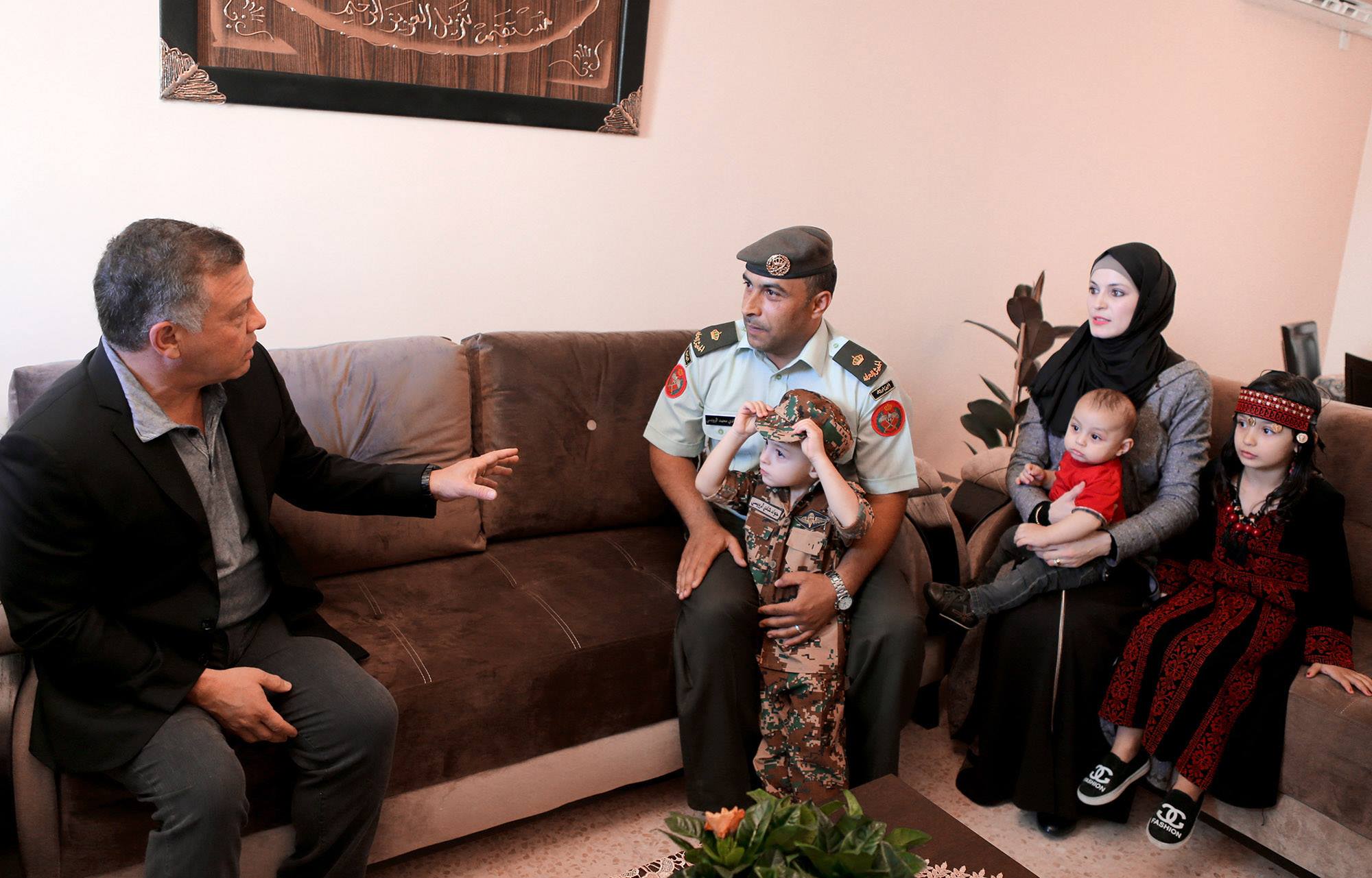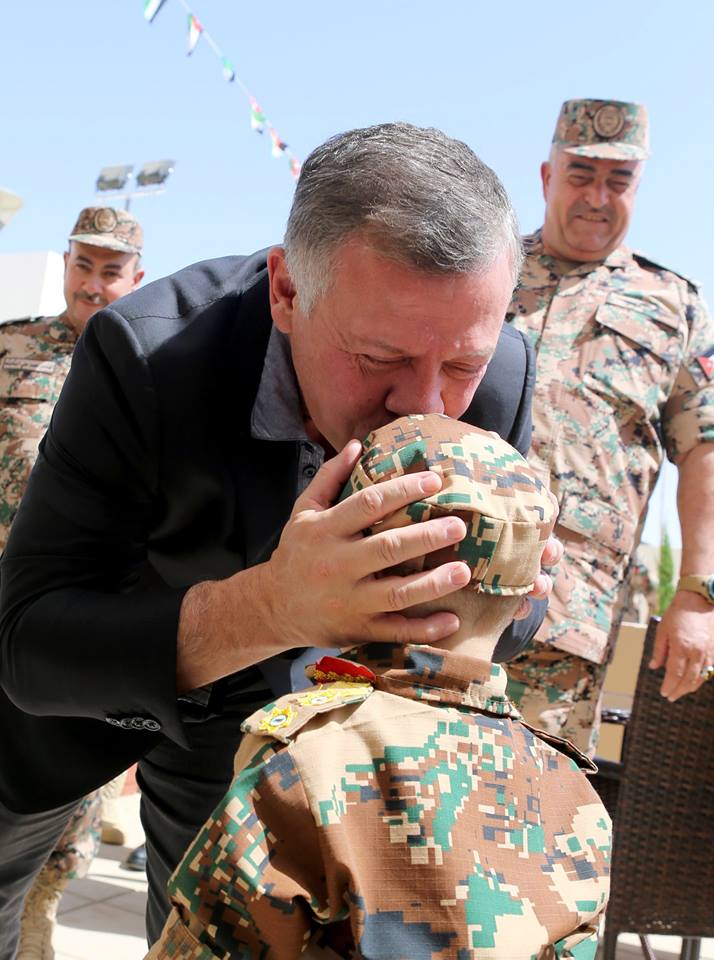 الطفل جواد الرويسي الذي ارتدى البزة العسكرية برتبة نقيب وهو ابن رائد في القوات المسلحة، بادله القائد الأعلى للقوات المسلحة الاردنية جلالة الملك عبد الله الثاني، التحية العسكرية، خلال افتتاح جلالته اليوم الاثنين المرحلتين الثانية والثالثة من مشروع إسكان ضاحية سمو الأميرة سلمى العسكري في الزرقاء، وزيارته لشقق سكنية في الاسكان.