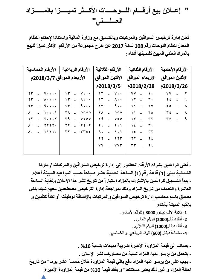رصد – أعلنت إدارة ترخيص السواقين والمركبات وبالتنسيق مع وزارة المالية واستنادا لإحكام النظام المعدل لنظام اللوحات رقم 108 لسنة 2017 عن طرح مجموعة من الأرقام الأكثر تميزا للبيع بالمزاد العلني المبين تفصيلها أدناه :