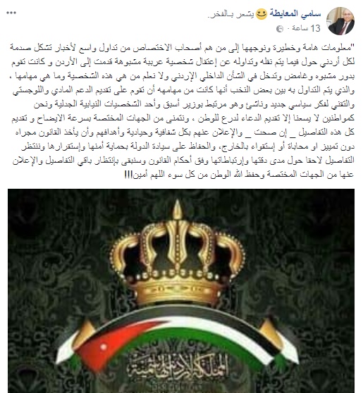 ‘معلومات هامة وخطيرة ونوجهها إلى من هم أصحاب الاختصاص من تداول واسع لأخبار تشكل صدمة لكل أردني حول فيما يتم نقله وتداوله عن إعتقال شخصية عرببة مشبوهة قدمت إلى الأردن و كانت تقوم بدور مشبوه وغامض وتدخل في الشأن الداخلي الإردني ولا نعلم من هي هذه الشخصية وما هي مهامها ، والذي يتم التداول به بين بعض النخب أنها كانت من مهامهه أن تقوم على تقديم الدعم المادي واللوجستي والتقني لفكر سياسي جديد وناشئ وهو مرتبط بوزير أسبق وأحد الشخصيات النيابية الجدلية ونحن كمواطنين لا يسعنا إلا تقديم الدعاء لدرع للوطن .