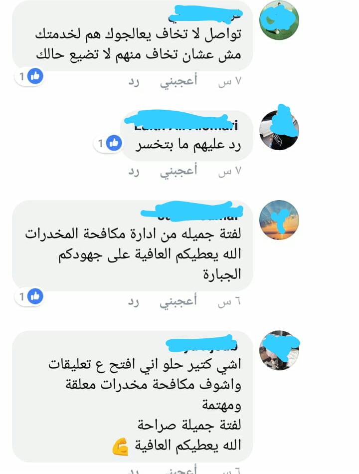 لم ينتهي الشاب بعد من الردود عليه منها الناصح ومنها المسيء ، الا وجاءه الرد من ادارة مكافحة المخدرات من خلال صفحتهم الرسمية ‘ نحن على أتم الاستعداد لمعالجتك… العلاج مجاني و سري بدون اي تبعيات قانونية…