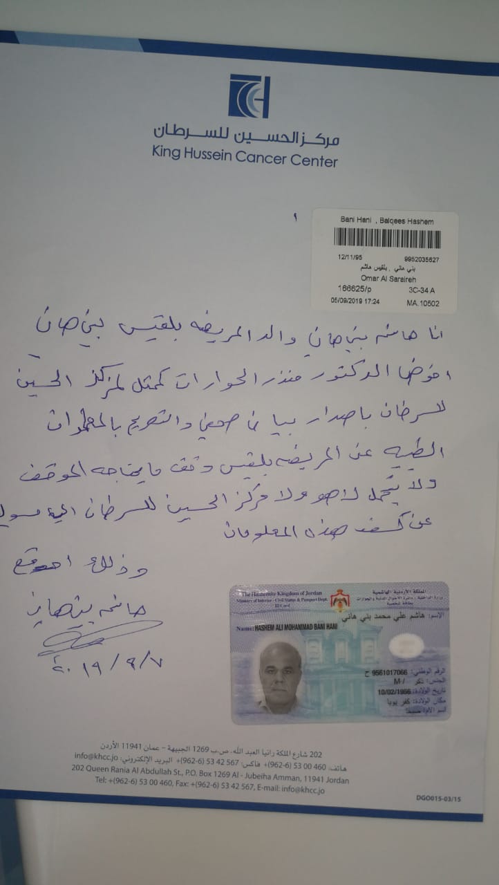 نحن كمركز الحسين للسرطان ليس من عادتنا تبادل معلومات المرضى للرأي العام كونها حق خاص للمريض ولكن لكثرة تداول هذا الموضوع على وسائل التواصل الاجتماعي واهتمام الرأي العام الذي نحترمه وتعاطفه مع هذه الحالة وبعد أخذ الإذن من المريضة وذويها قررنا أن نبادلكم هذه المعلومات.