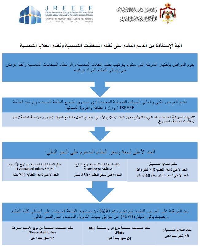 ويتم تقديم العرض الفني والمالي للبنك الاسلامي الاردني والذي يعتبر من الجهات التمويلية المعتمدة لدى صندوق تشجيع الطاقة المتجددة وترشيد الطاقة/ وزارة الطاقة والثروة المعدنية، بعد الموافقة على العرض المقدم يتم تقديم دعم مقداره 30% من اجمالي كلفة النظام من خلال صندوق تشجيع الطاقة المتجددة، فيما يقوم المواطن بتقسيط باقي المبلغ وهو 70 % من كلفة هذه الانظمة من خلال البنك الاسلامي الاردني على النحو التالي: 48 شهرا لانظمة الخلايا الشمسية و24 شهرا لانظمة السخانات الشمسية من نوع المرايا المسطحة Plate Flat و12 شهرا لانظمة السخانات الشمسية من نوع الانابيب المفرغة.